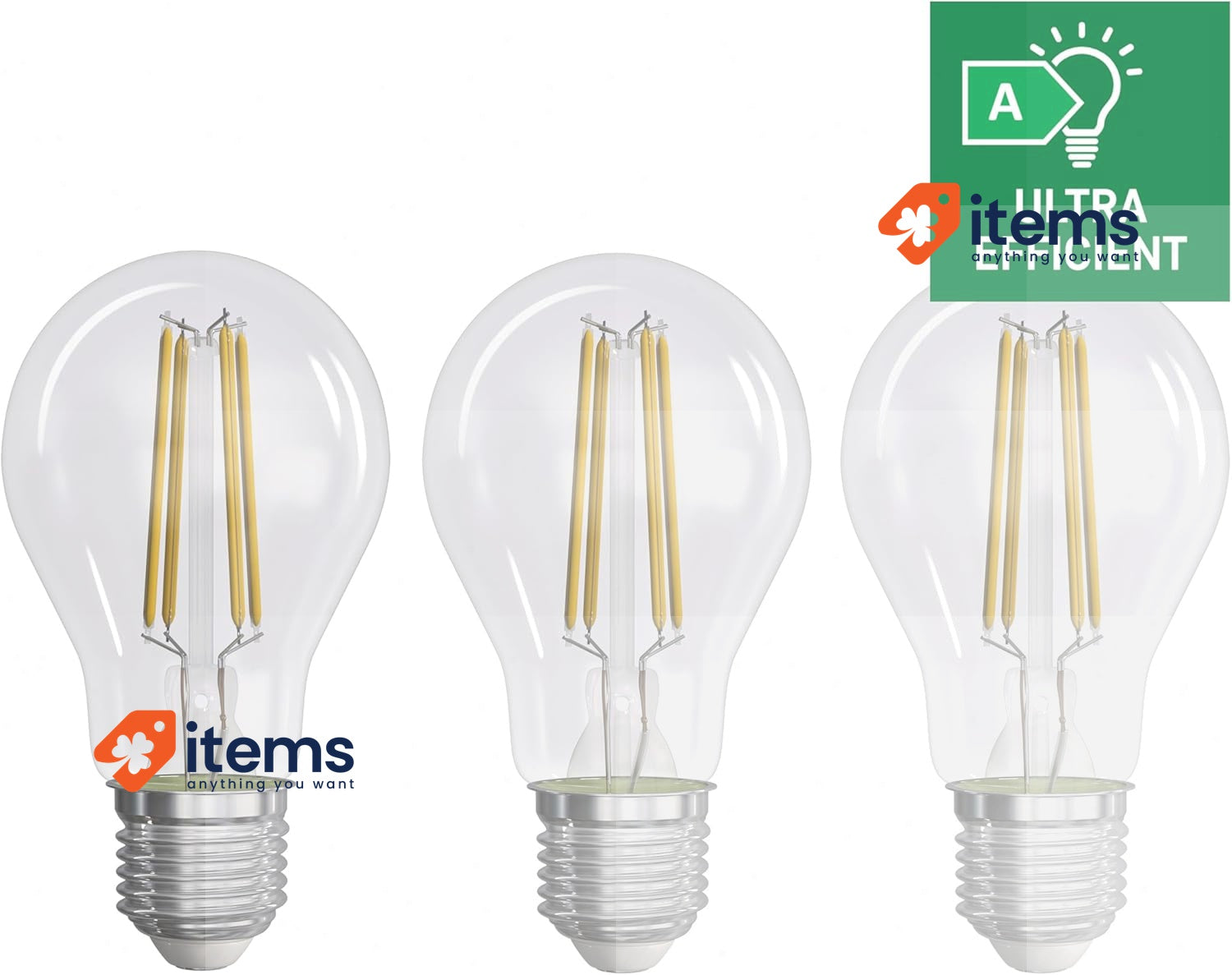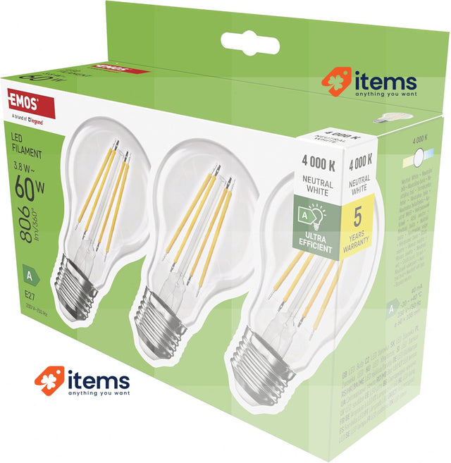 3.8W (instead of 60W bulb) - 50 000 hours - angle 300° - CRI min. 80-3 packEMOS - LED bulb filament A60 - A class Vintage bulb - E27 base - neutral white - 806lm - extra-saving