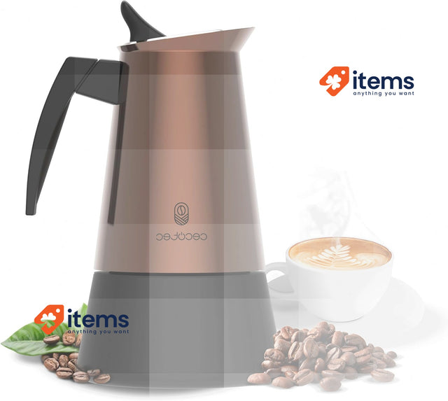 Capacity 100 ml for 2 cupsCecotec Italian Coffee maker Piccolina 200 BronzeElegant Steel DesignSafety valveSilicone closureStainless Steel FilterSuitable for all surfaces