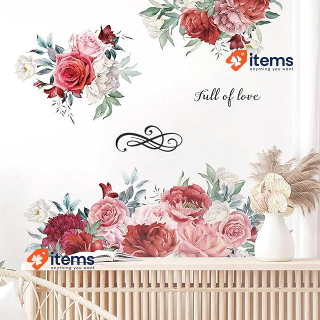 Supzone Wall decal Red Rose Pentecostal Flower Wall Sticker Large Flower Bouquet Wall Sticker Love theme for living room Bedroom Kitchen Sofa TV Background Wall deco
