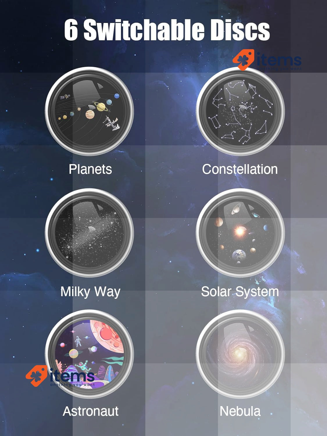 UNBON Projector Stars Planetary Galaxy LED Projector with 6 Disk Interchangeable 4 Colors 3 Brillo Light Projector Night Light with Original Gift Temporer for Children Drink